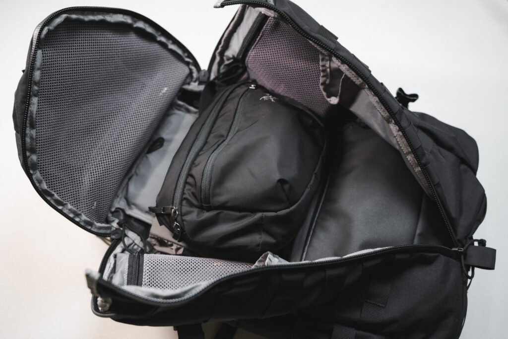 内部構造やポケット配置は弟分のMax EDCとほぼ共通で、ガジェットポケットや多数の仕切りを完備。